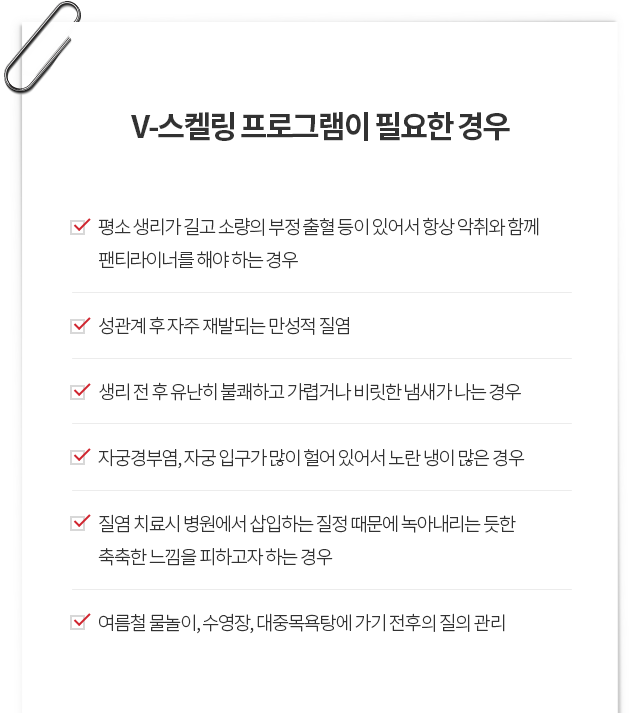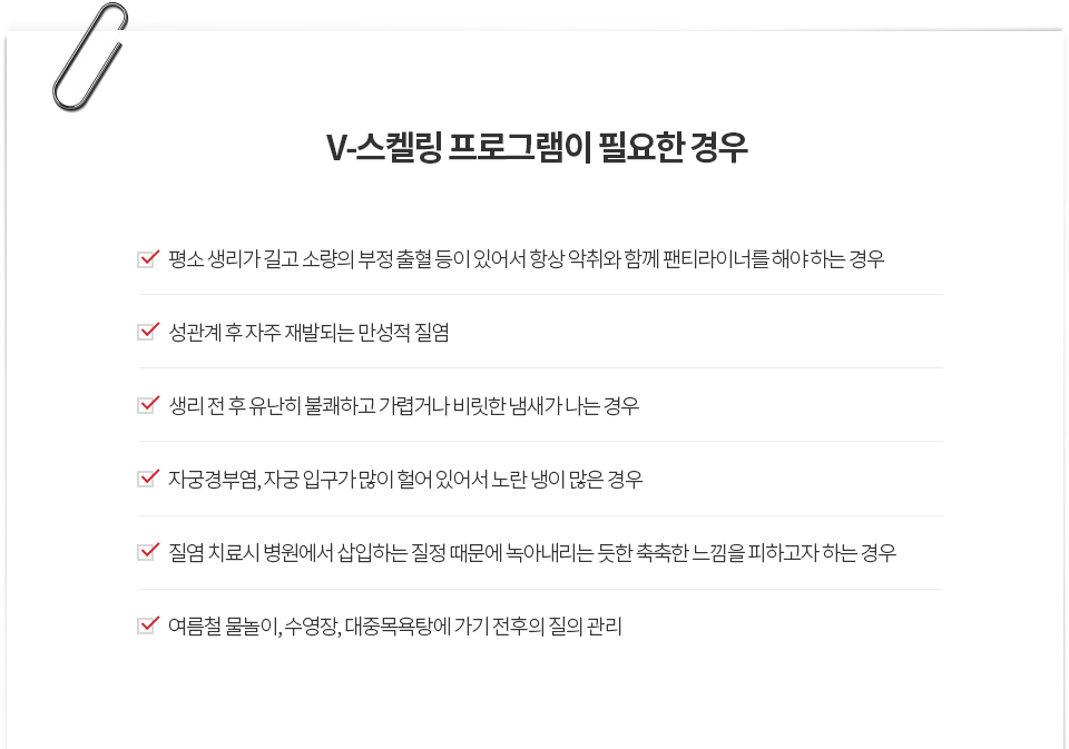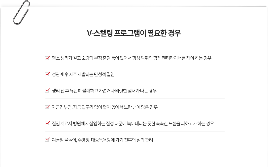 V-scaling을 통해 깔끔한 세정 효과로 질내 세균 제거와 악취제거를 하고 생리 후 질벽 주름 사이에 남아있는 잔혈을 제거함으로써 개운치 않은 느낌을 말끔하게 해소할 수 있습니다.